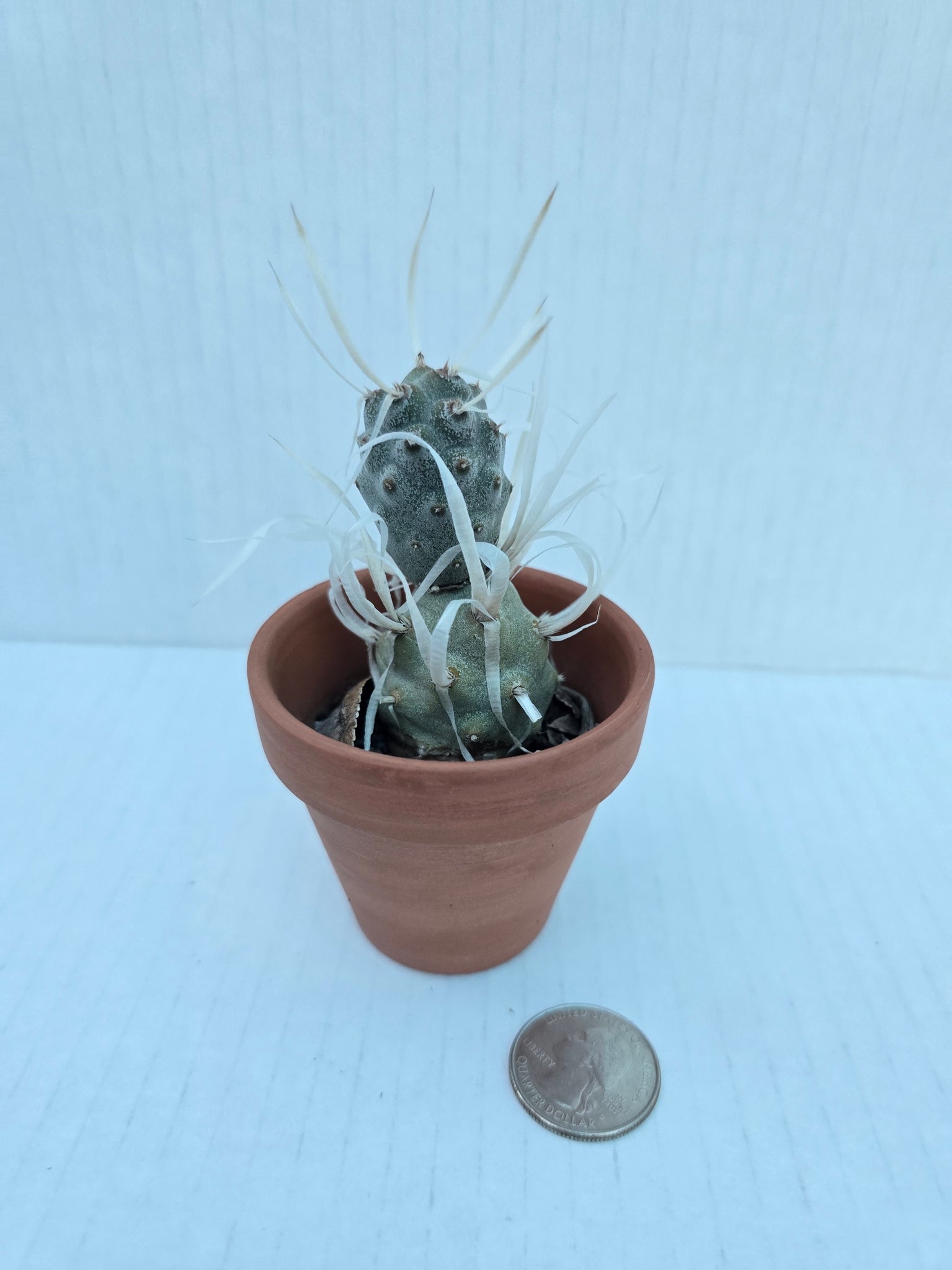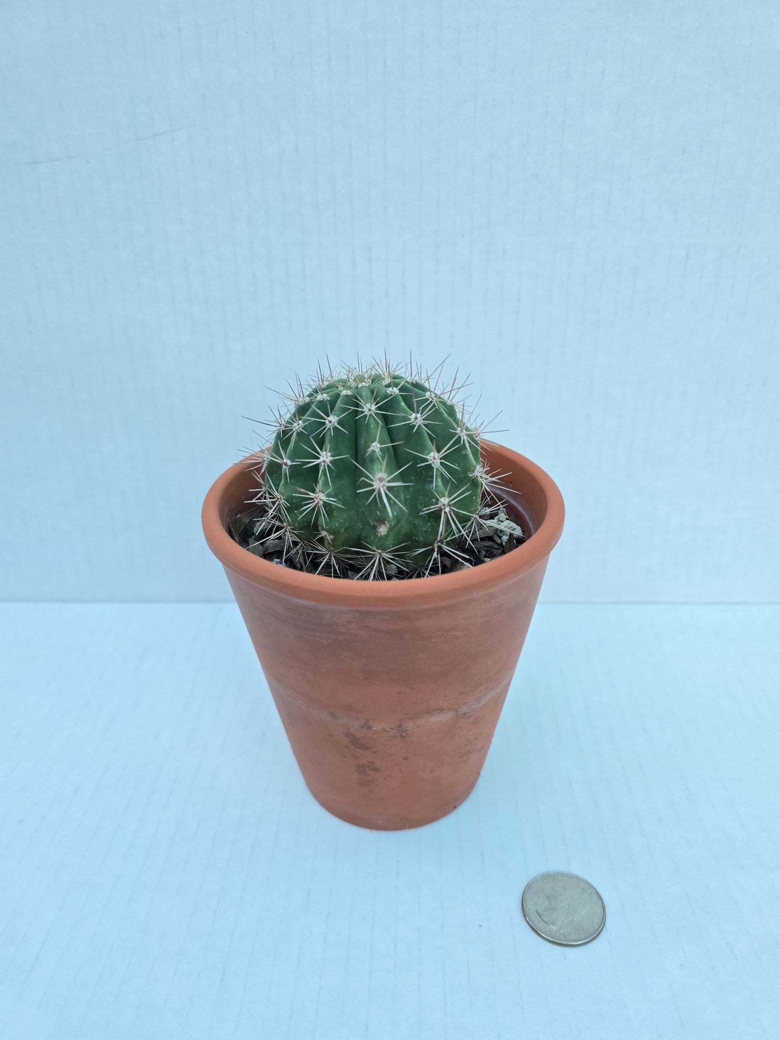 Live cactus in a 2–4.5 inch clay pot (sizes vary; quarter in photo for scale)